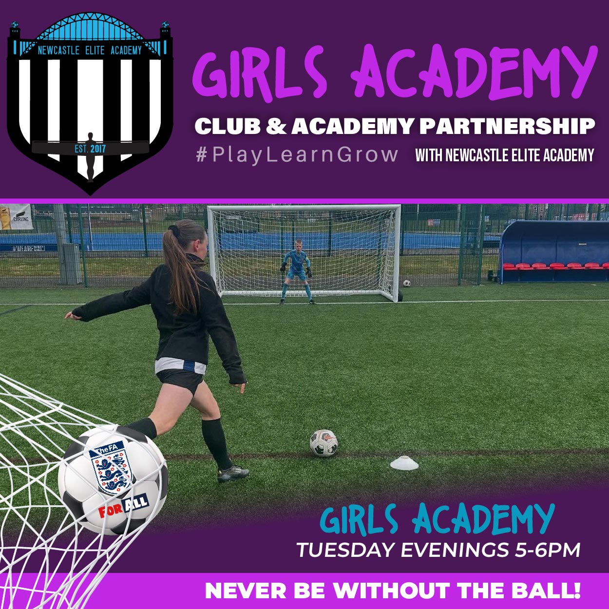 Never be without the ball!. NEW NEA Girls Academy re-starting 13th January. Technical sessions focusing on developing each player individually. Smaller groups for more coach/player time. Session Structure: Ball Mastery, Session Themes, Small-Sided Games.
