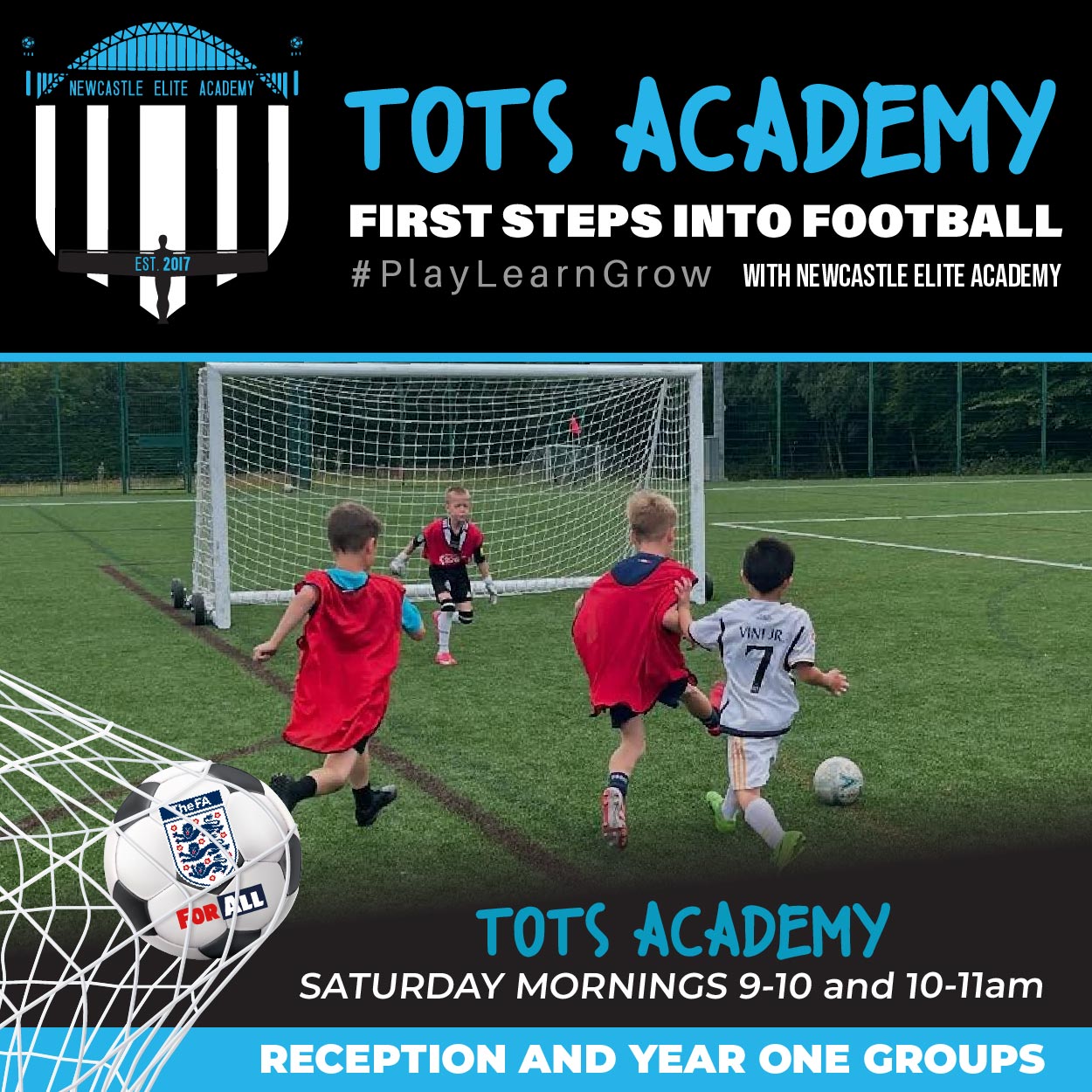 Learn while playing football. NEW NEA Tots Academy re-starting 17th January. Tots Academy is your first step into football! No experience needed. Play football while also taking part in a themed weekly story. Bring your parents! We are happy for them to get involved. Progression into our weekly development centres.